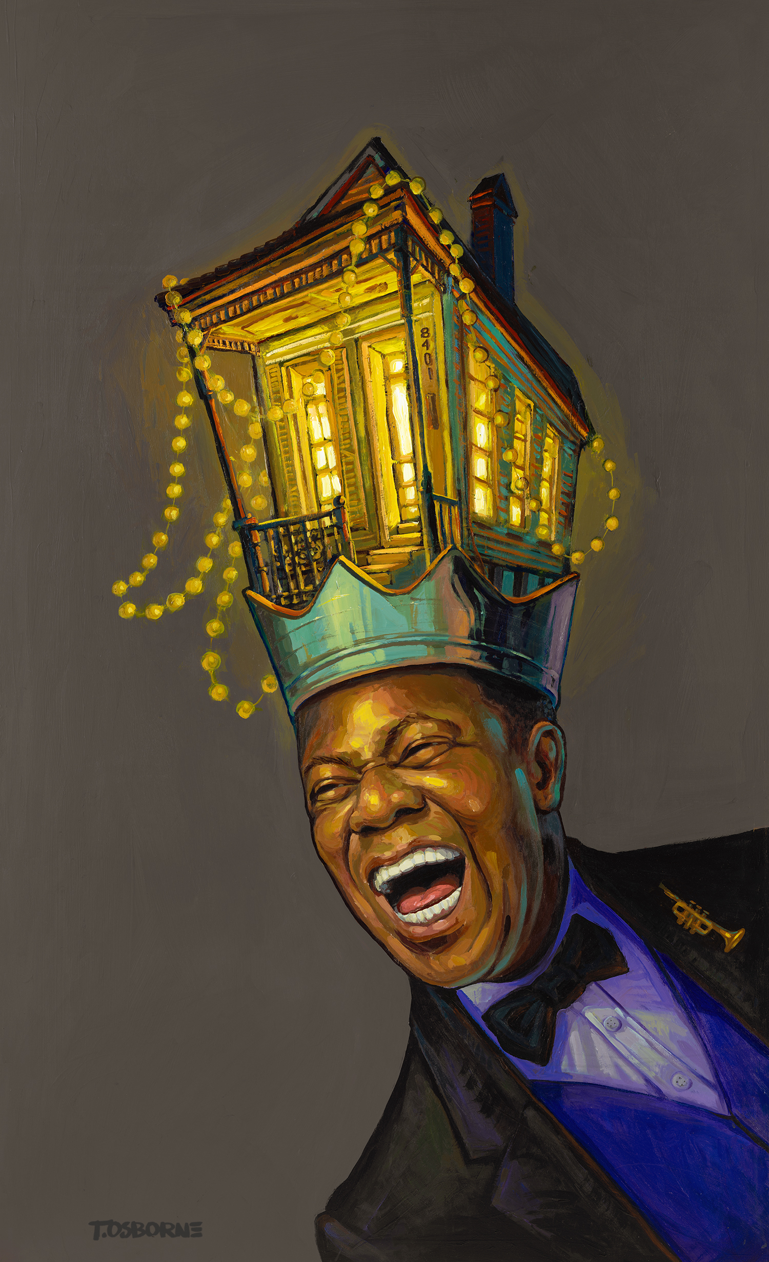 “Louie The First” is a tribute to Louis Armstrong- one of the greatest and most well recognized musical legends of the world. I wanted to capture his radiant smile, crown him and give Louie a New Orleans shotgun house as a headdress. The home address bears his birthdate (8-4-1901). His lapel is fastened with a trumpet, of course. -T. Osborne